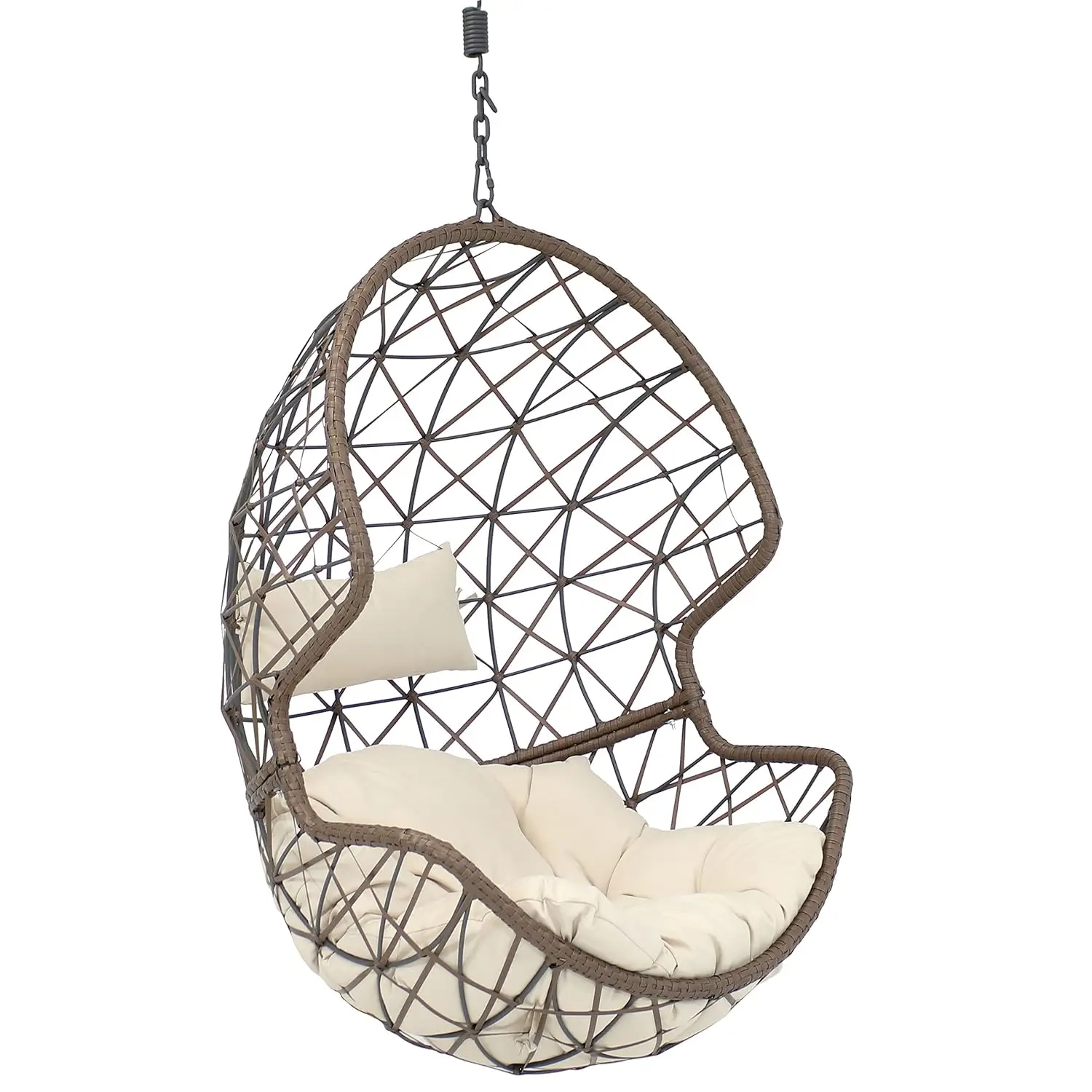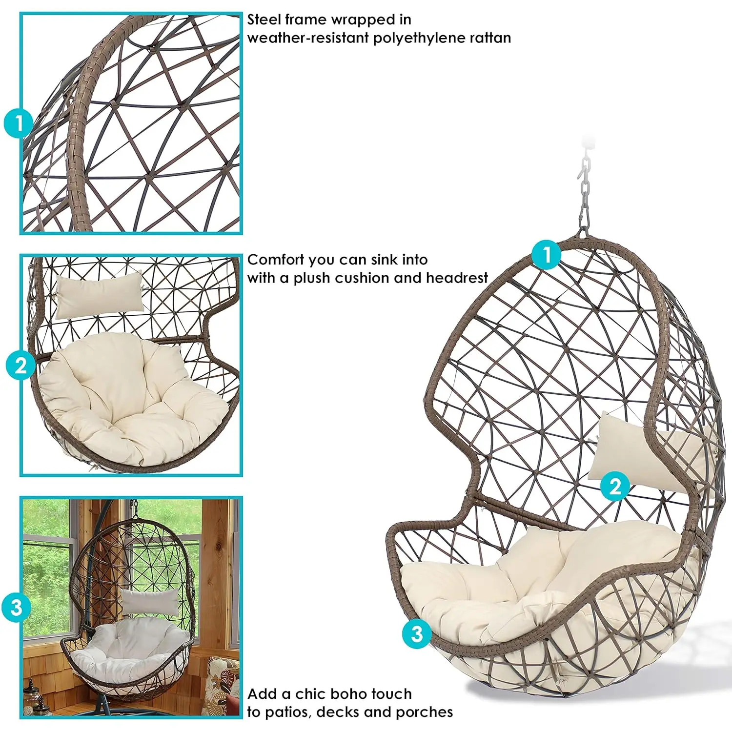 ALL-WEATHER CONSTRUCTION: This bedroom swing is made of polyethylene rattan resin wicker wrapped around a steel frame for weather-resistant protection, strength and durability. The cushion and headrest pillow covers feature a polyester material and polyurethane fiber fill cores.