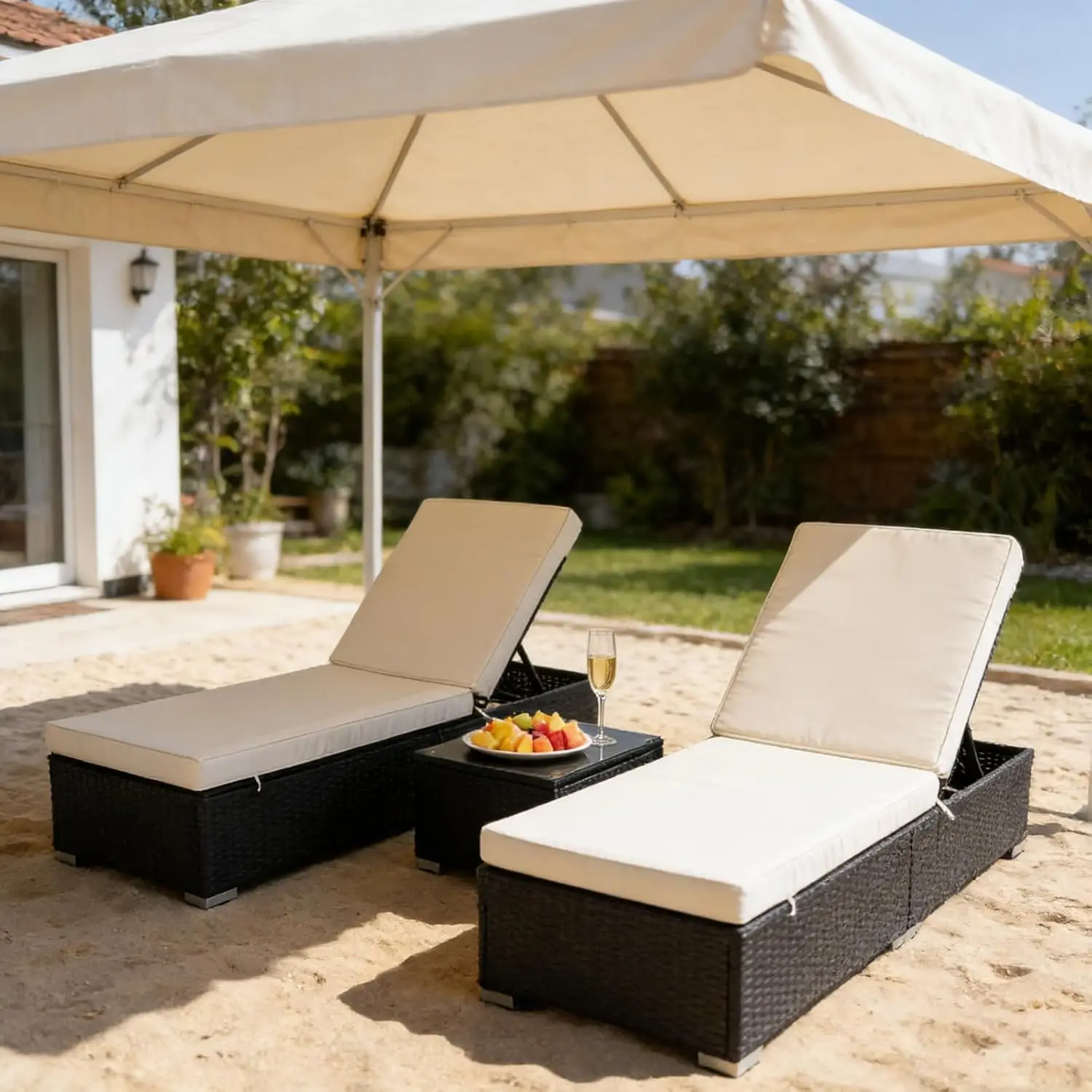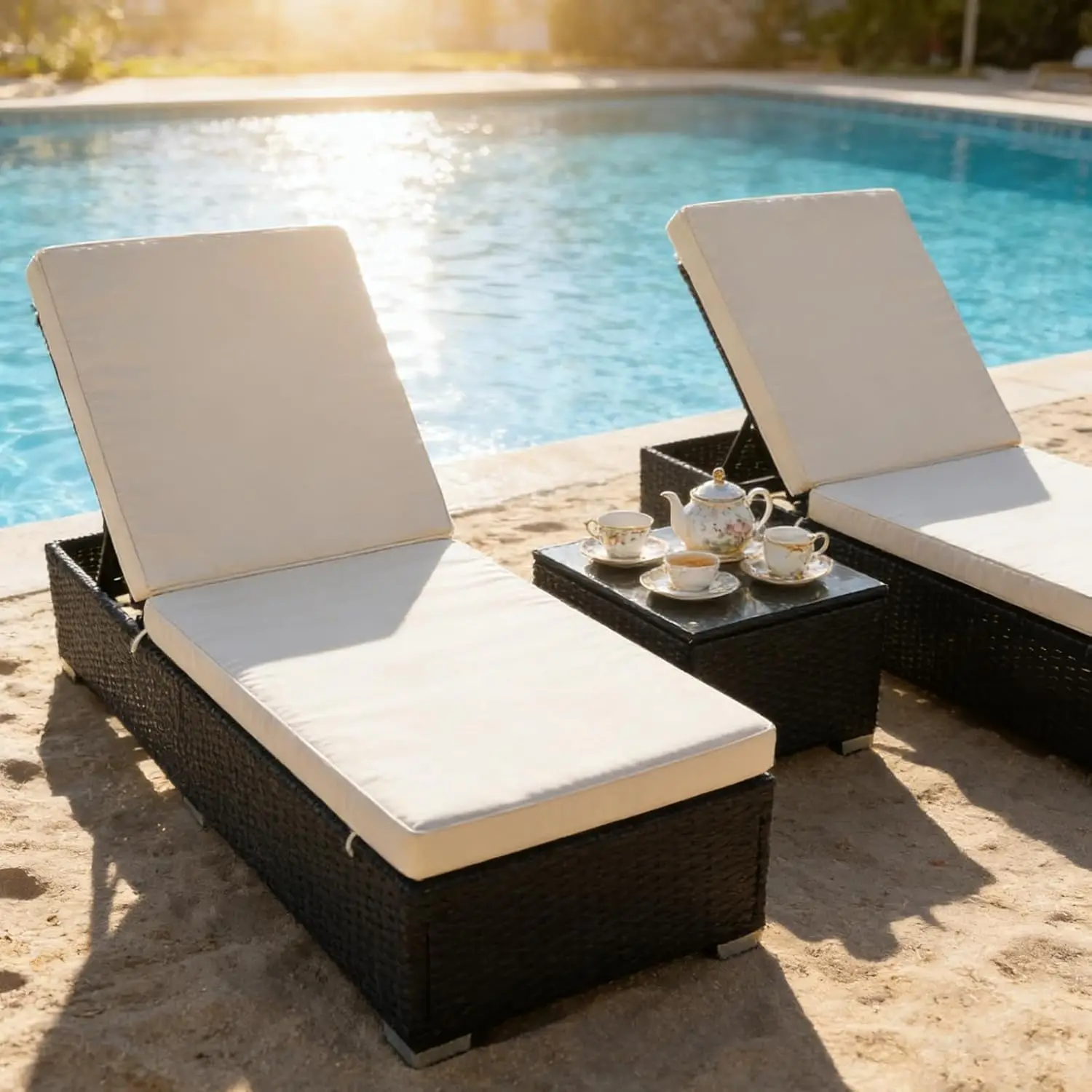 2 Wicker Lounge Chairs + Table:Our outdoor lounge chair includes two chaise lounge chairs and an outdoor table. Invite over a friend, sip tropical drinks, and tan outside in the open air.